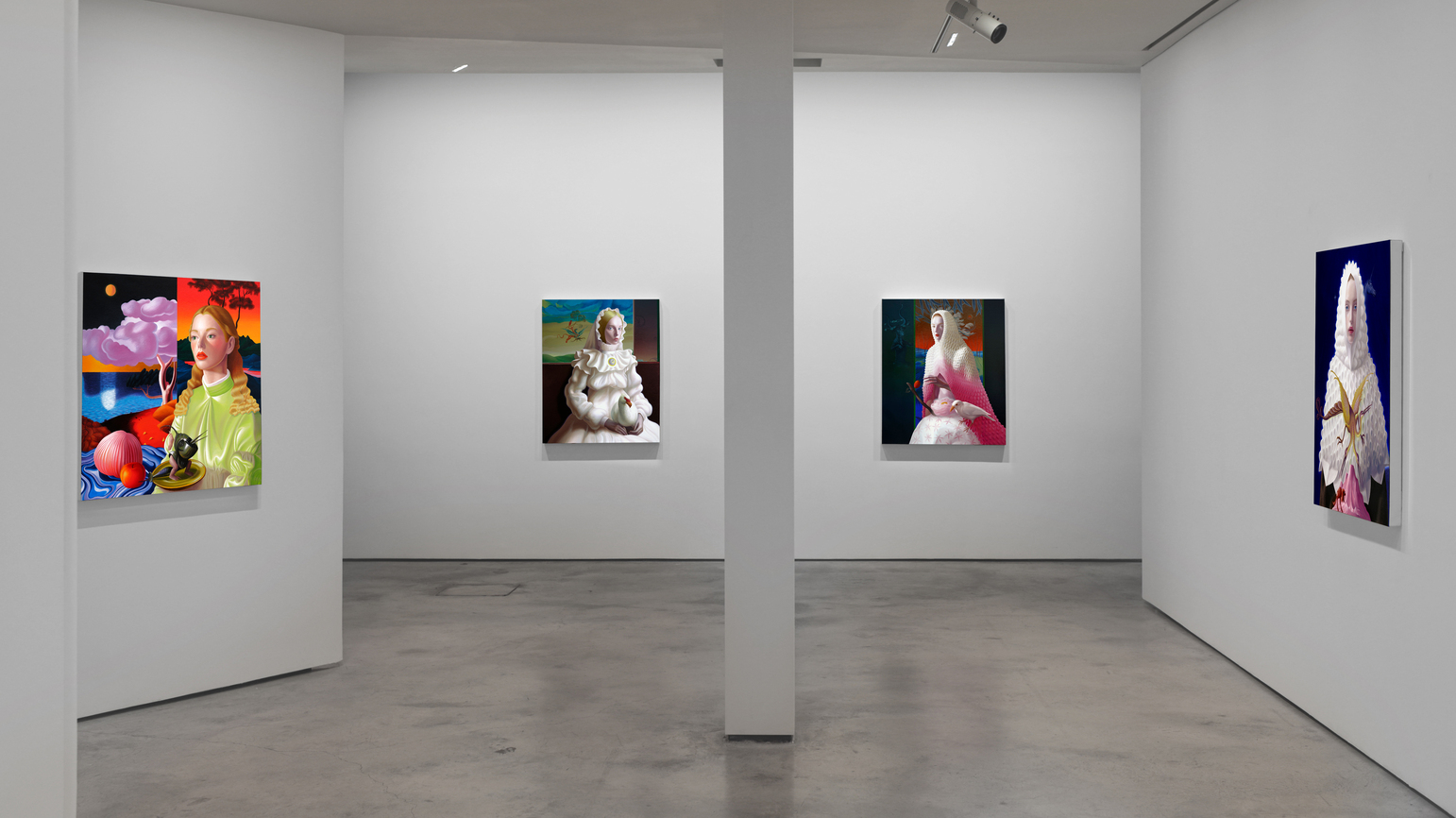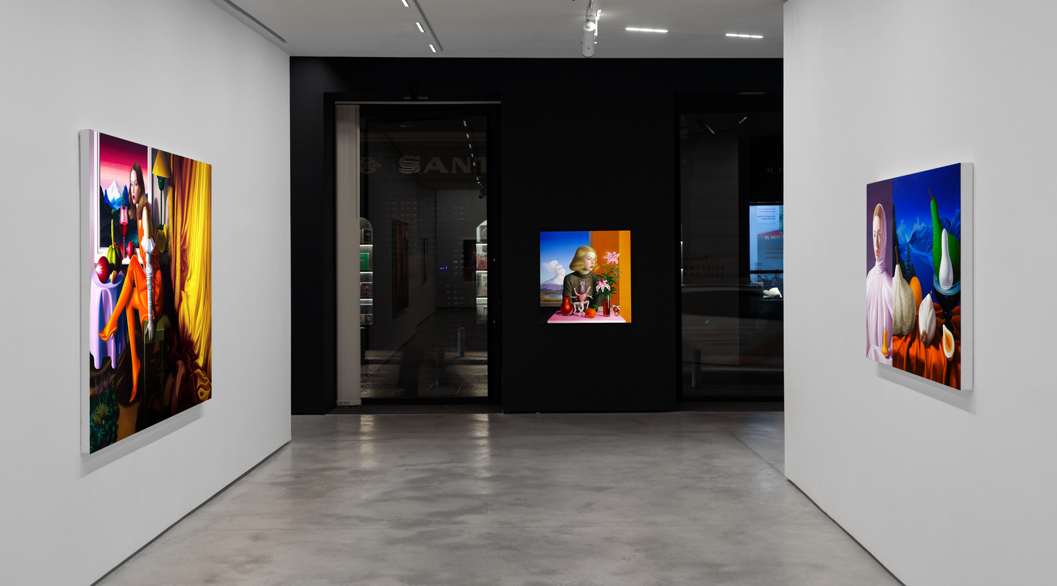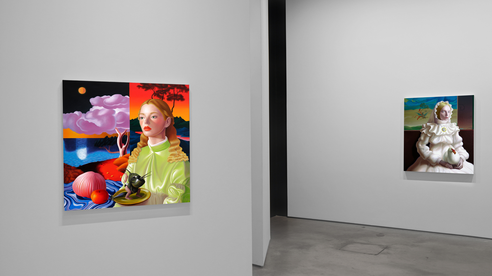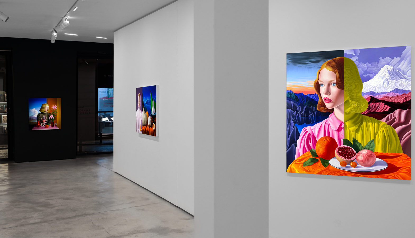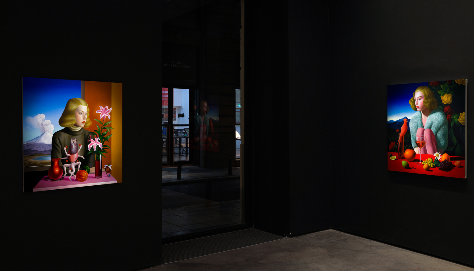 Tras años siguiendo la tradición pictórica rumana y creando obras con un trasfondo social o político, Grecu quiso hacer lo contrario: crear un trabajo que resultara impactante de una manera hermosa. Pensando en los viejos maestros que se adelantaron a su tiempo al adoptar nuevos materiales y herramientas, recurrió a la Inteligencia Artificial en busca de un concepto capaz de recrear una escena de tipo renacentista proyectada hacia el futuro. A partir de ahí, comenzó a fusionar tres motivos fundamentales de la pintura figurativa —el retrato femenino, el paisaje y la naturalez muerta— en una única lógica pictórica. En lugar de funcionar como géneros separados, estos recursos operan como registros superpuestos. La identidad, la emoción y la presencia se transmiten a través de la figura; la comprensión del mundo o del entorno, a través del paisaje; y las claves materiales, simbólicas o temporales, a través de los objetos y las frutas. Combinados, constituyen el kit definitivo de la pintura figurativa: un elenco estelar de elementos capaces de producir composiciones densas y estratificadas.