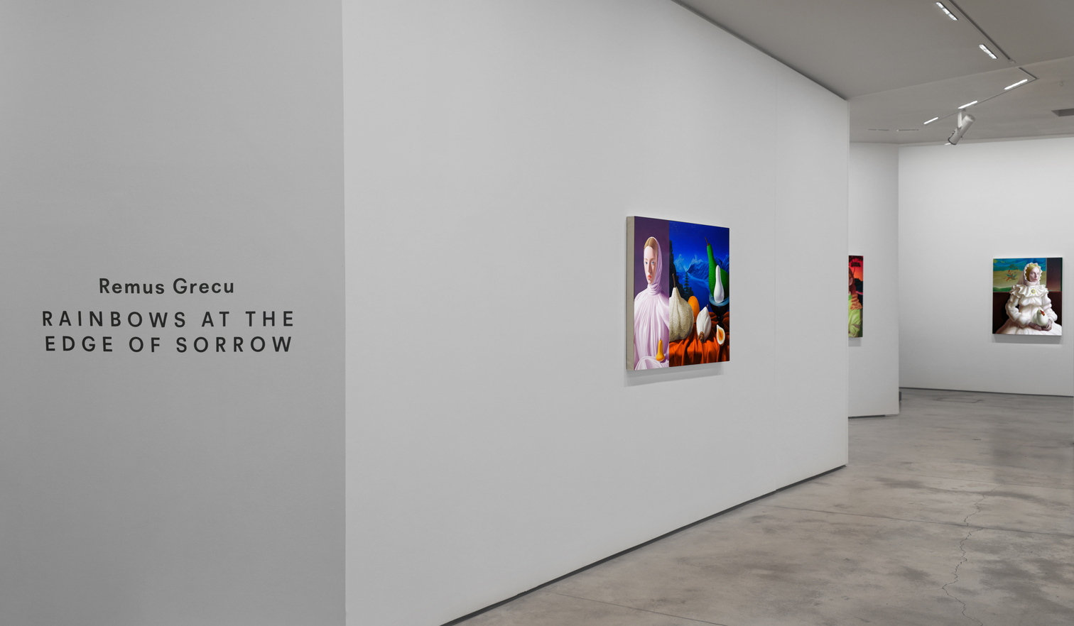 Esta idea se inspiró inicialmente en Un anciano con su nieto de Ghirlandaio, en el encuentro con los colores vibrantes de las pinturas de Lorenzo Lotto y en el deseo de capturar la estética pulida, respaldada por la tecnología, del siglo XXI. Como resultado, en lugar de cultivar el dor —la añoranza melancólica y omnipresente asociada a la tradición pictórica rumana—, las nuevas obras de Remus Grecu se centran en una idealización plástica de la belleza. En lugar de la vida rural atemporal y el retrato estoico, su tema central pasa a ser el motivo perenne de la musa femenina, acompañada de arreglos igualmente atemporales de naturalezas muertas y frutas. El vínculo atávico entre las personas y la tierra está ausente, y estas figuras entumecidas, similares a muñecas de porcelana, se sitúan deliberadamente a distancia de su entorno natural. El espectro completo de colores brillantes y vibrantes —Grecu aplica varias capas de pigmentos naturales— ha reemplazado la paleta tradicionalmente terrenal de ocres profundos y blancos “sucios”, mientras que el pesado impasto escultórico ha dado paso a una ejecución sedosa y brillante que subraya una perfección imposible. De este modo, pasa de una síntesis de la espiritualidad bizantina y el modernismo occidental terrenal a un híbrido de clasicismo occidental y la artificialidad, sublimidad y naturaleza glitch de la Midjourney IA. Utiliza estos elementos como tres ingredientes de un plato que siempre sabrá bien, aunque su sabor cambie ligeramente cada vez.