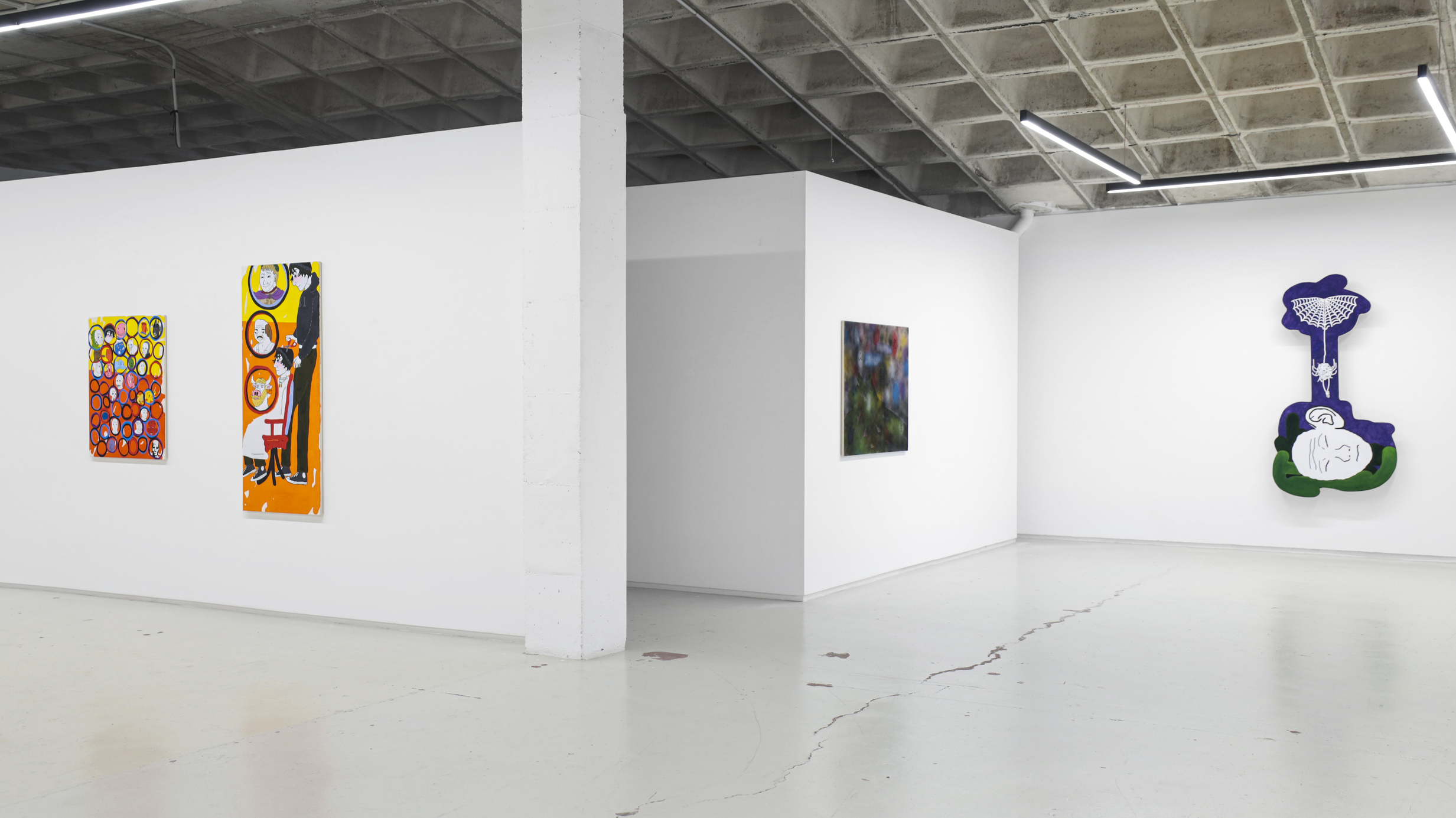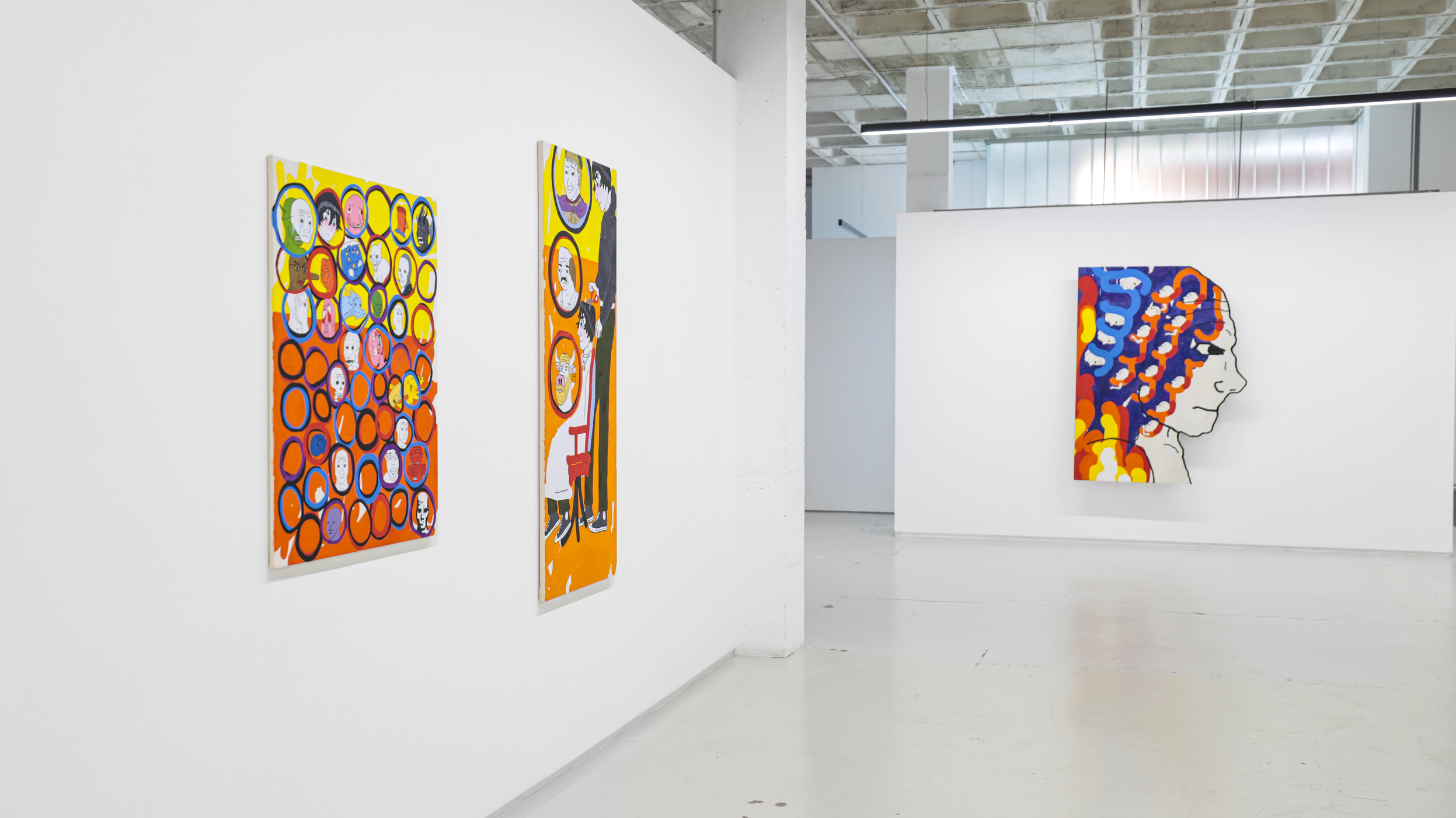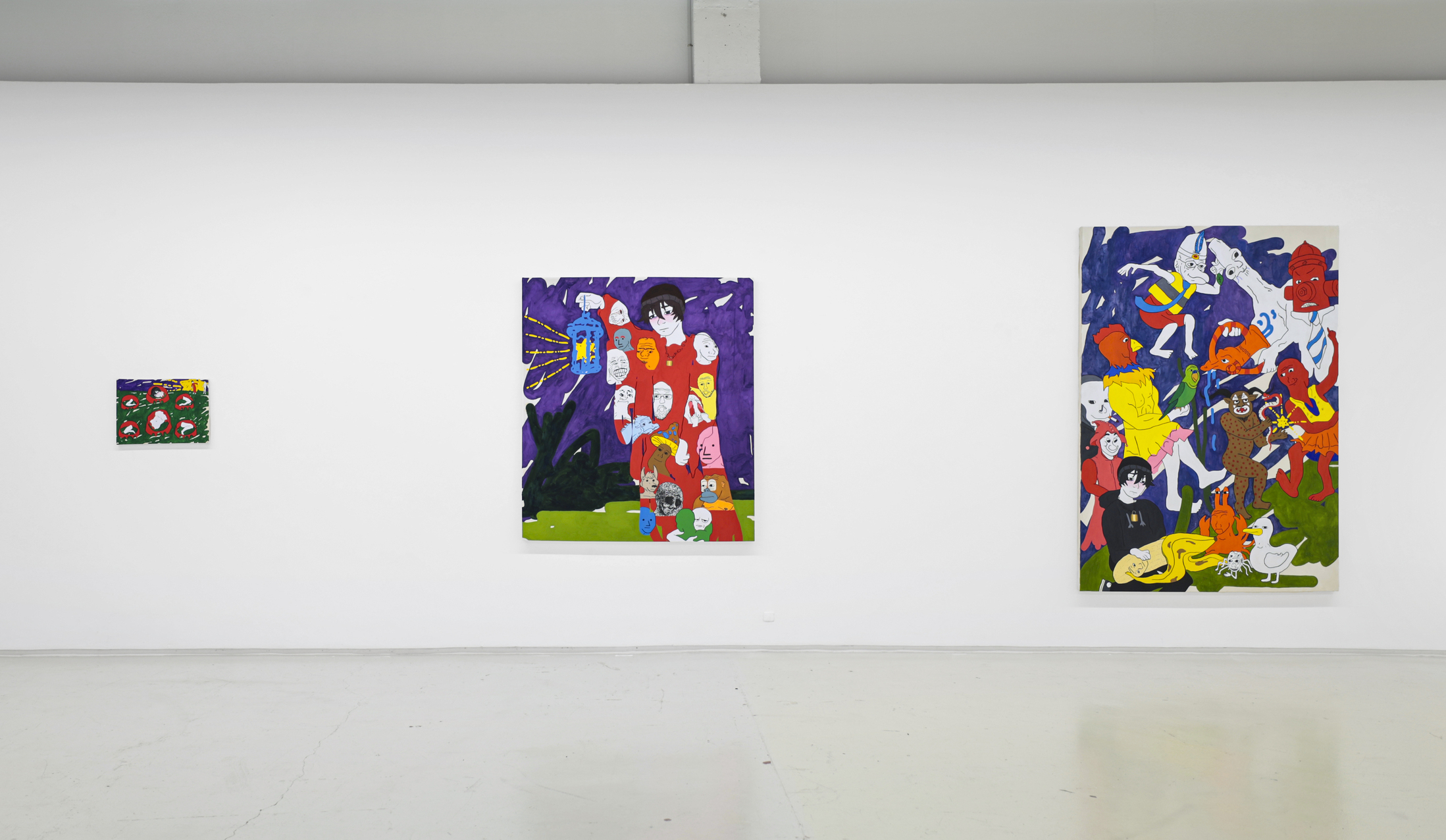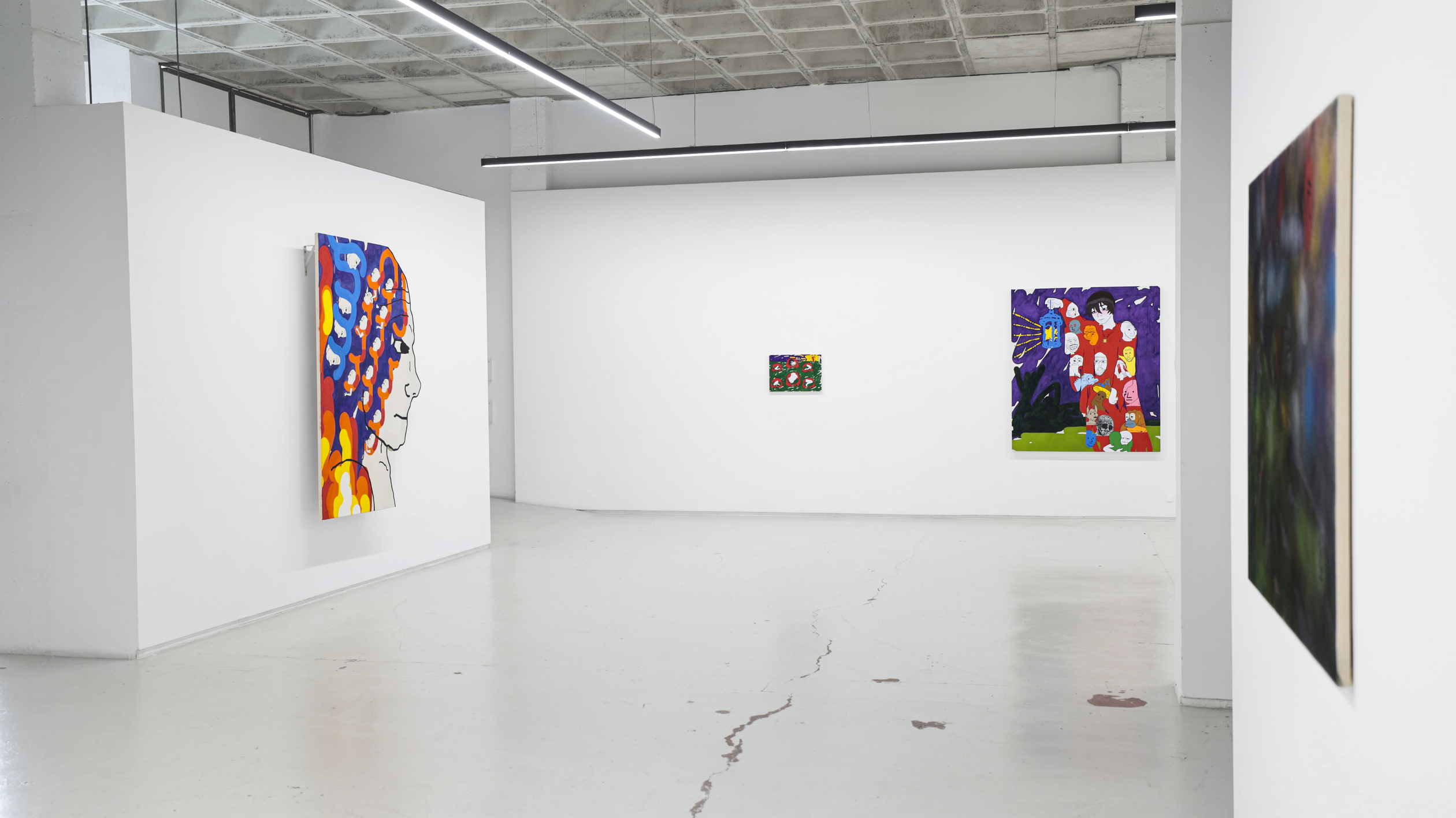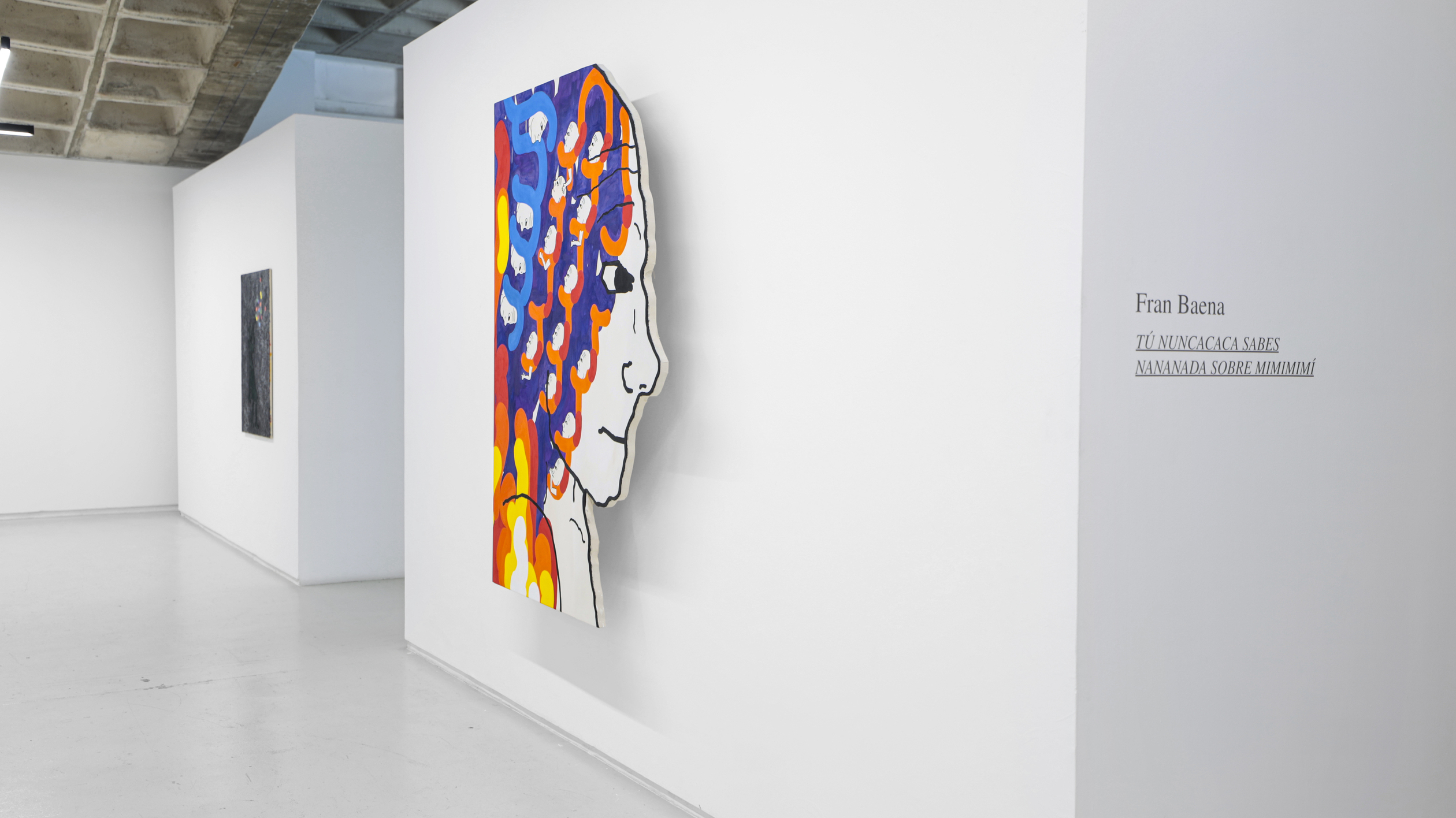 Su título, ‘Tú nuncacaca sabes nanananada sobre mímímímí”, que a su vez se apropia del de una pieza de la última individual del autor en Granada, en los Condes de Gabia. Precisamente, un nutrido número de piezas de la muestra hacen alusión al retrato, como ese runrún de voces e identidades tras las cuales todos nos ocultamos (y de ahí que este mismo texto adopte la forma de máscara, para que tú mismo, querido lector o lectora, formes parte de este juego de impostores impostados). Frente a estas propuestas más escénicas y figurativas, donde se ven reflejadas los pensamientos de sus personajes (distintos doppelganger del artista), otros cuadros, que se intercalan entre los mismos a modo de interludios en una composición musical, más abstractos, en los que destacan unas bolitas de colores que parecen salir del instrumento de un flautista mágico y que van ocupando e iluminando los fondos negros sobre los que se disponen, dejando entrever algo de esperanza.