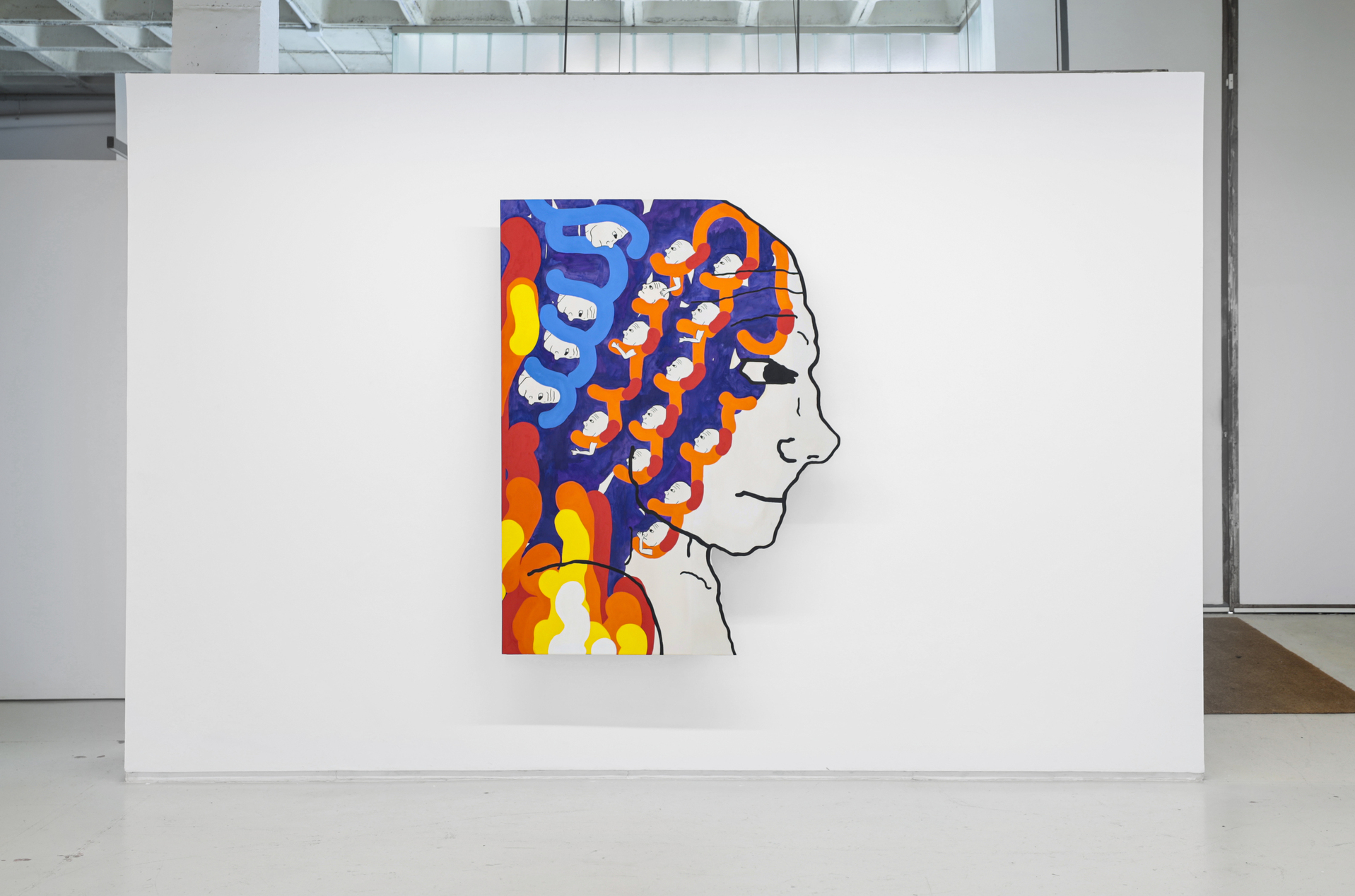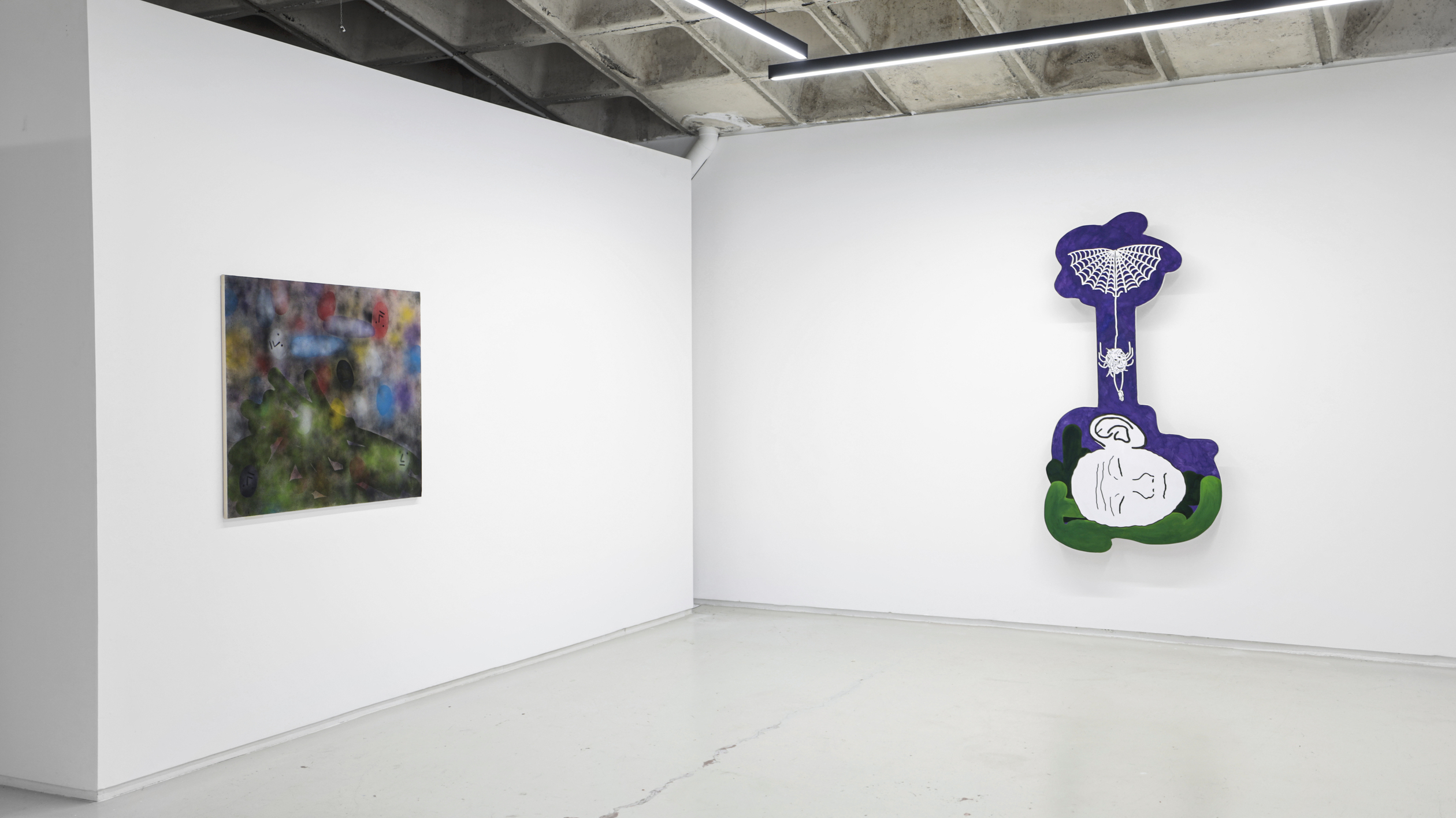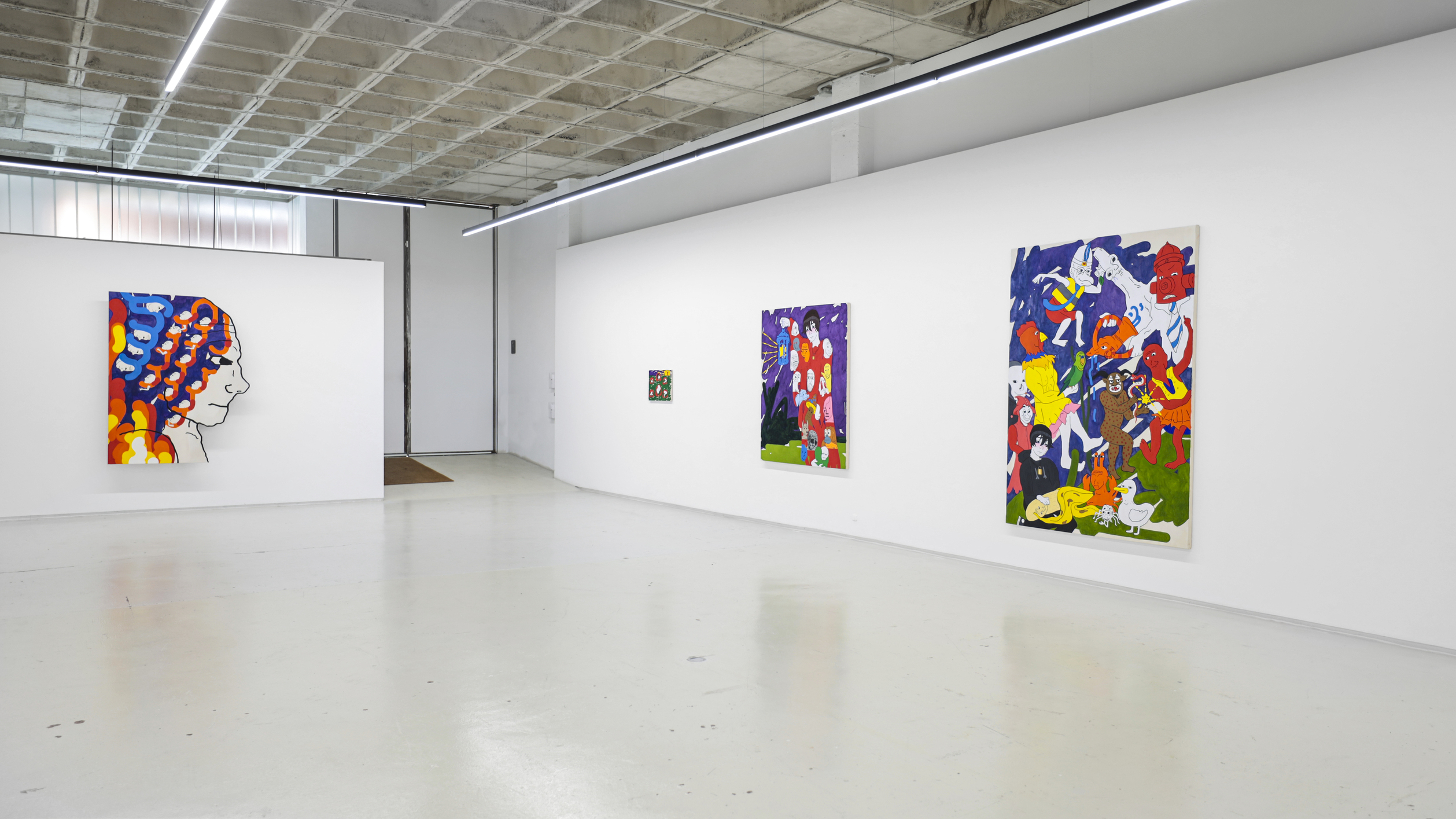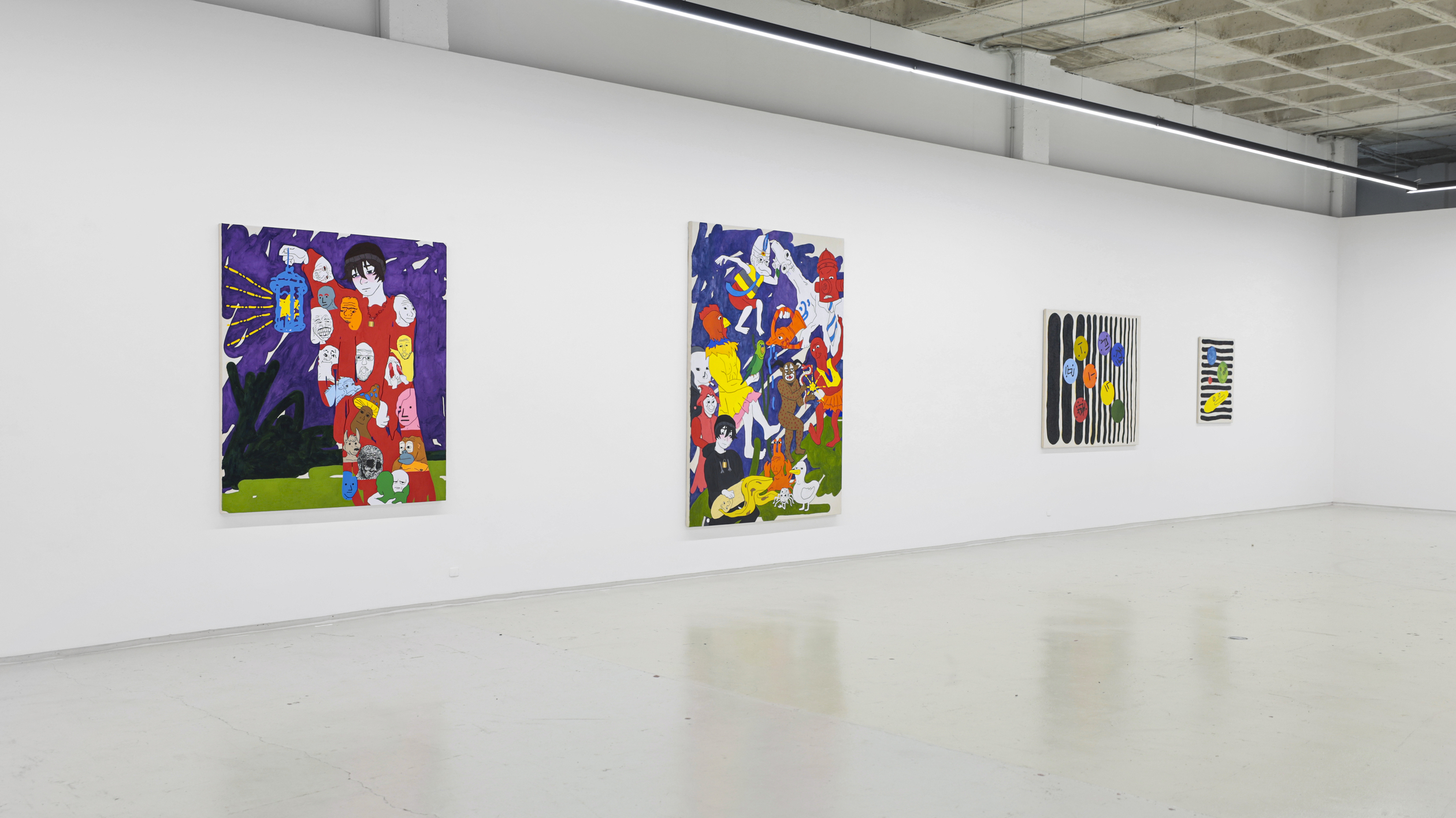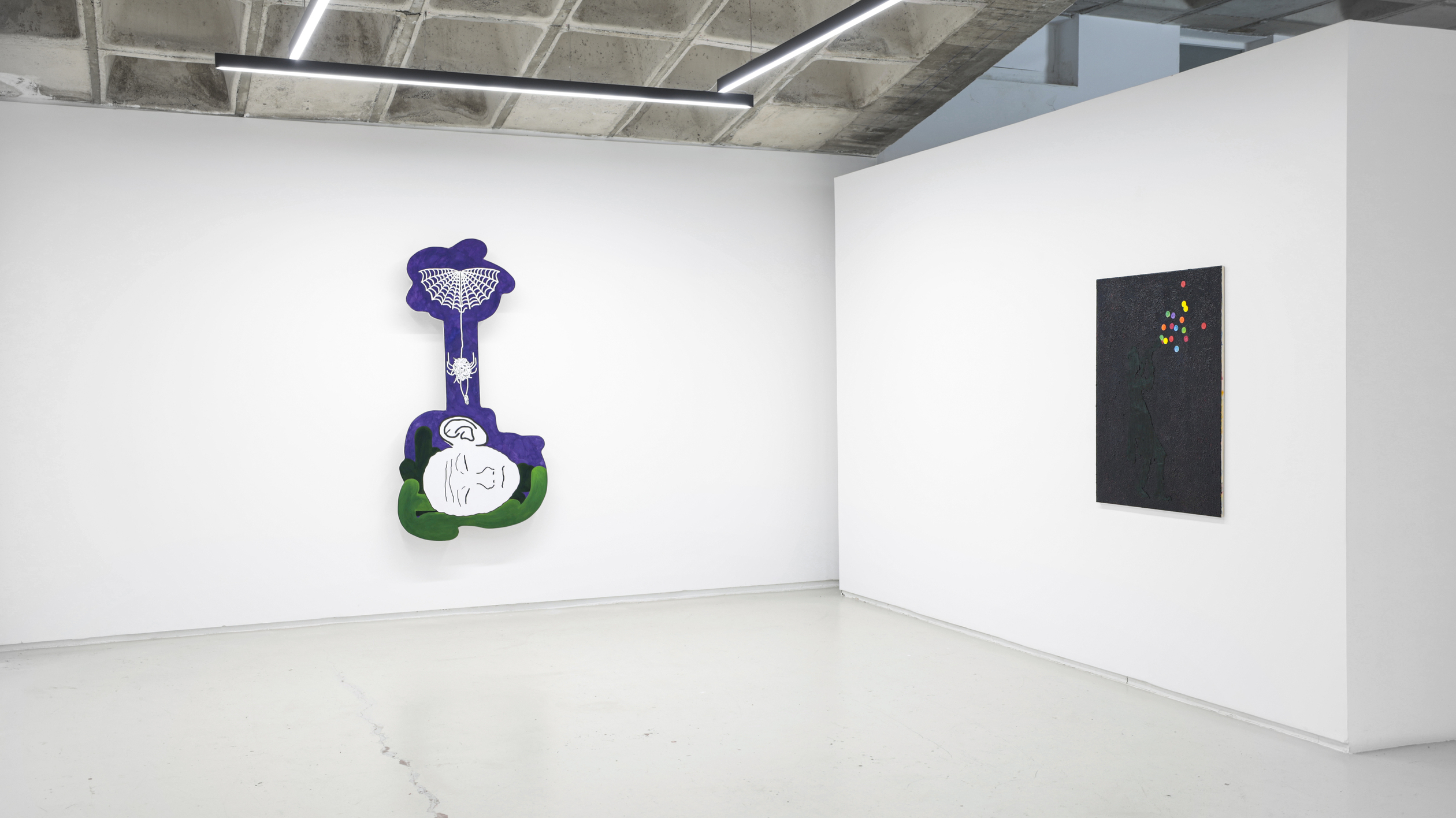 Su título, ‘Tú nuncacaca sabes nanananada sobre mímímímí”, que a su vez se apropia del de una pieza de la última individual del autor en Granada, en los Condes de Gabia. Precisamente, un nutrido número de piezas de la muestra hacen alusión al retrato, como ese runrún de voces e identidades tras las cuales todos nos ocultamos (y de ahí que este mismo texto adopte la forma de máscara, para que tú mismo, querido lector o lectora, formes parte de este juego de impostores impostados). Frente a estas propuestas más escénicas y figurativas, donde se ven reflejadas los pensamientos de sus personajes (distintos doppelganger del artista), otros cuadros, que se intercalan entre los mismos a modo de interludios en una composición musical, más abstractos, en los que destacan unas bolitas de colores que parecen salir del instrumento de un flautista mágico y que van ocupando e iluminando los fondos negros sobre los que se disponen, dejando entrever algo de esperanza.