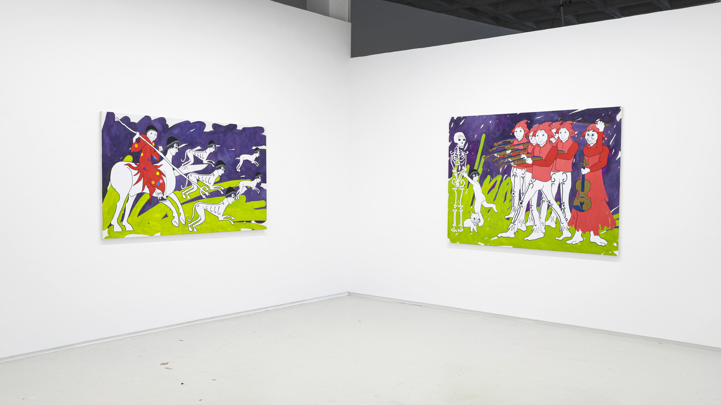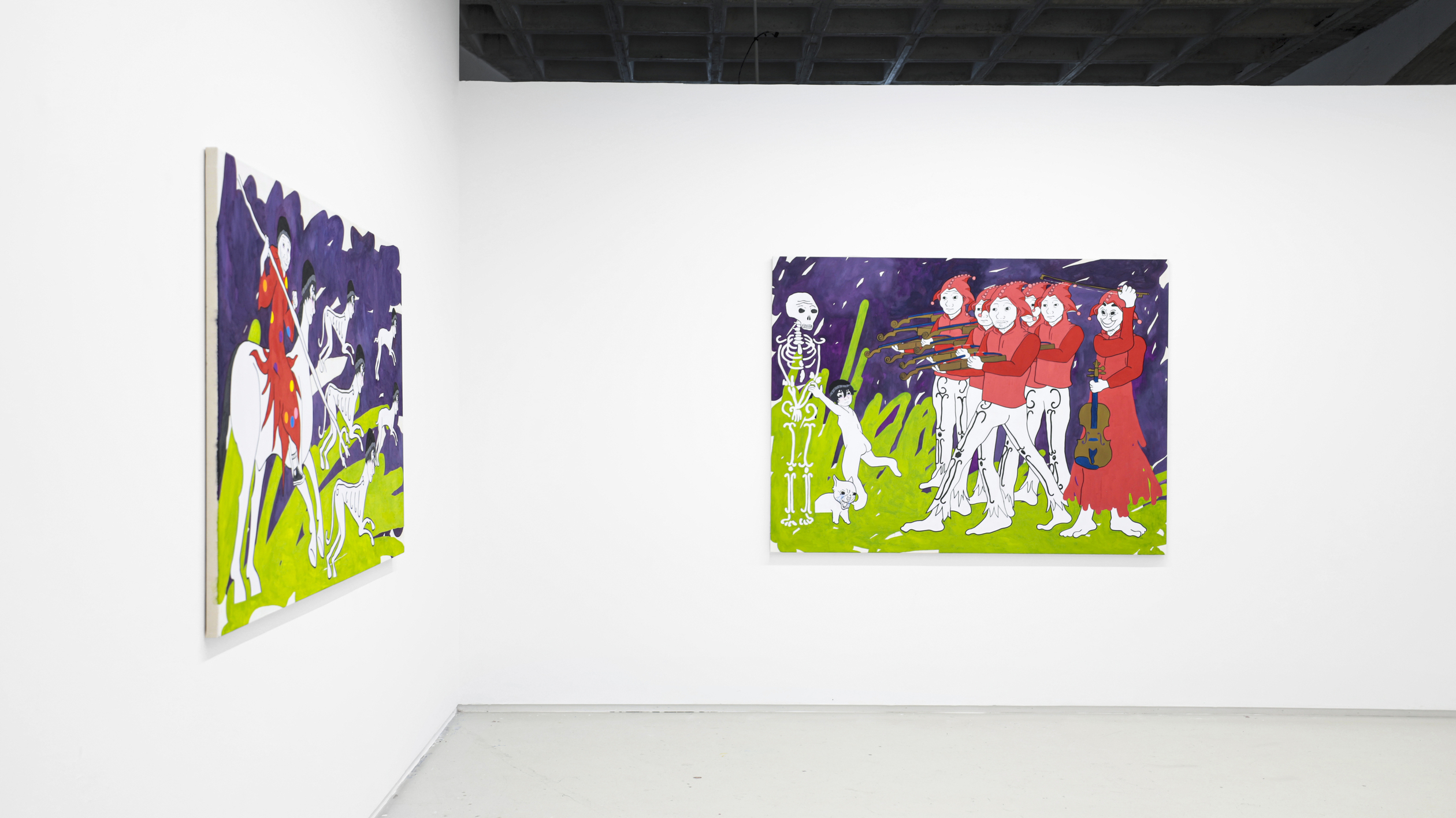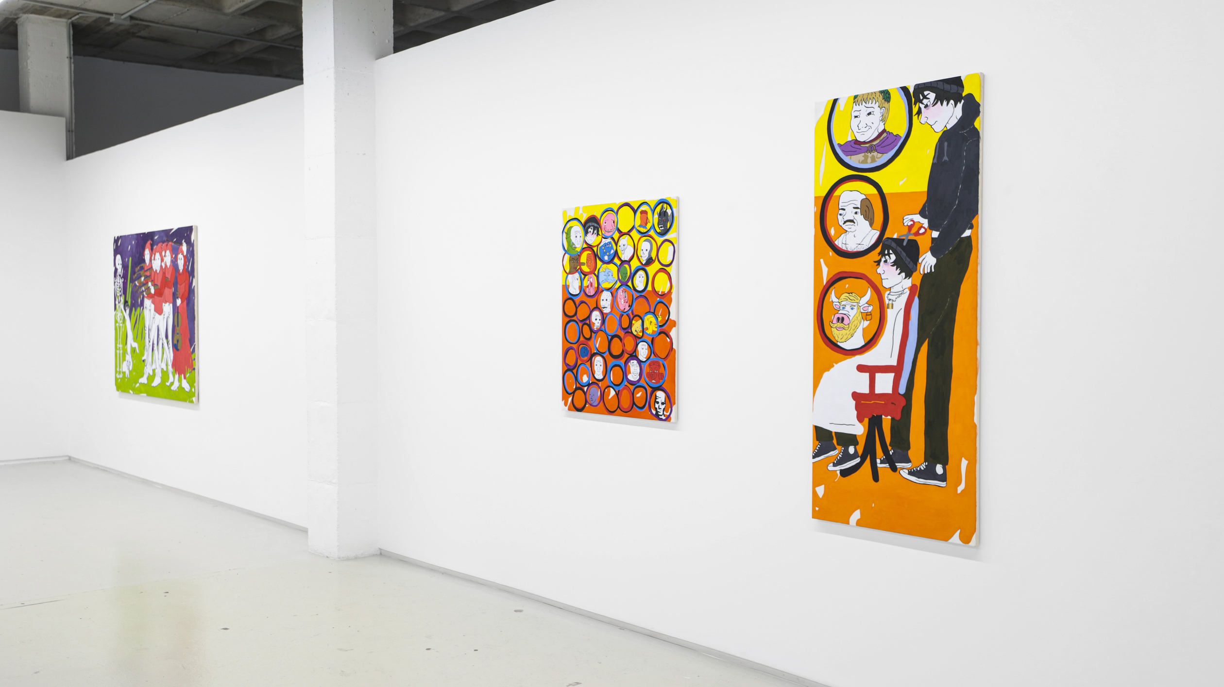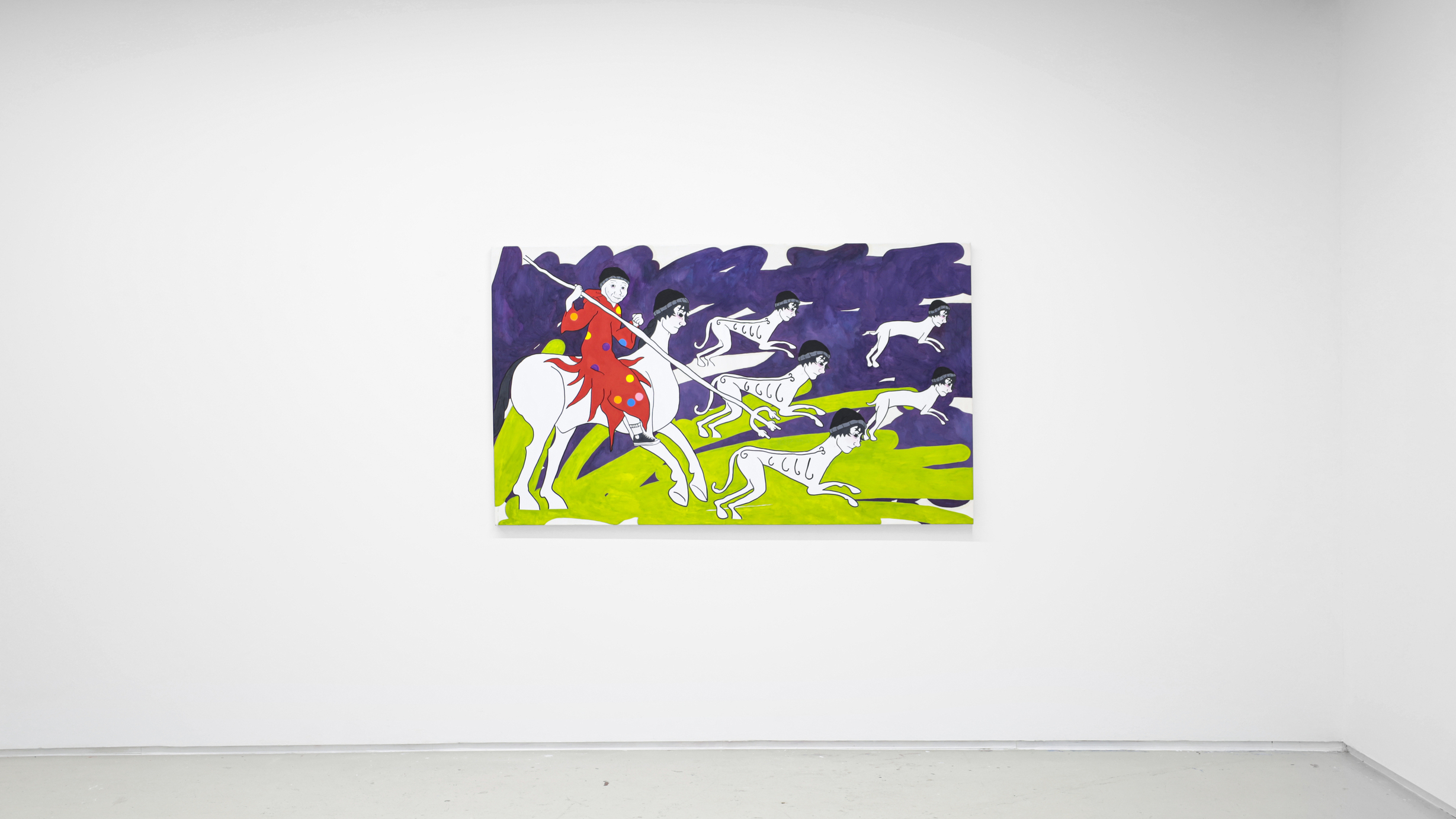 Así que, aquí me ves, intentado convenceros yo a vosotros por escrito de que soy la persona más conveniente para poneros al corriente del trabajo de un creador que ha hecho de la risa amarga, del humor de mueca que produce picazón, seña de identidad. Para explicaros la entereza de un meme, de las ‘cursed images’ o el ‘shitpost’ (hasta yo mismo he tenido que ‘googlear’ lo que acabo de escribir. Y hasta ‘googlear’ es de abuelos, que lo suyo ya es buscar los significados en esos otros oráculos de Delfos que son TikTok o Chat GPT). Precisamente sobre falsos mesías, sobre síndrome del impostor versa este conjunto de obras recientes del cordobés, que dice vivirlo en sus propias carnes. Primero, confiesa, porque su corta edad (atención al virtuosismo de Fran Baena con tan solo 25 añitos, con una cabeza bien amueblada que ya la quisieran para sí presidentes de empresas eléctricas o mandatarios del Primer Mundo: Make Art Great Again) le impide darse cuenta de las alegrías que ya le ha otorgado el ejercicio de su profesión y que le está dando pie a cumplir “el sueño de aquel adolescente con depresión al que le hacían bullying y que decidió que si no era capaz de desinscribirse de la vida después de tanto sufrimiento, entonces era porque no quería irse de este mundo sin aportar su granito de arena”. Estas cuestiones, bajo una apariencia naif, agridulce o atolondradamente desenfadada ya la trató en series anteriores. Y luego, porque igual que el meme se tiene que componer de materiales de archivo preexistentes, donde se diluye la autoría de las creaciones, el artista se alimenta de referentes. Y Fran le da las gracias a Picasso por animarle a robar y a convertir su quehacer en actividad de reciclaje; a Warhol y a Picabia por hacerlo con color y composición; a Ross Bleckner, a Angélica Liddell y a Paula Rego por imponer cierto misterio;  y hasta a la ermita de San Baudelio, en Casillas de Berlanga, de donde parte el caballo del wojak del lienzo “Ensalada de guantazos”, uno de sus álter egos en esta cita.